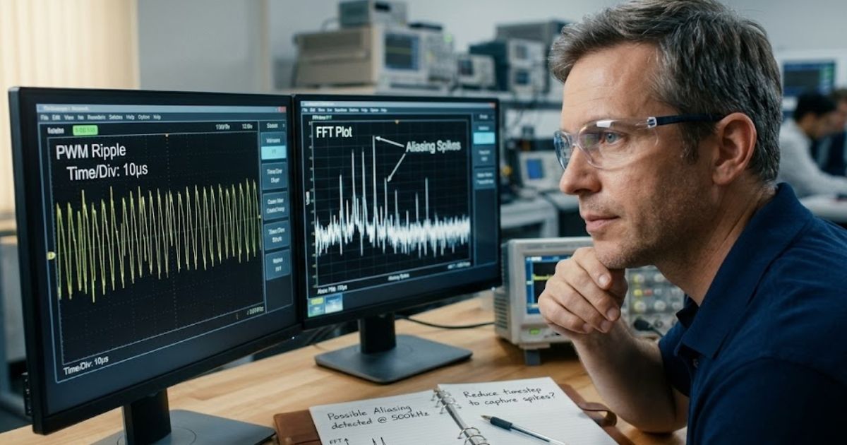 Aliasing is the quiet failure mode that misleads teams, because the waveform still looks “clean.” Sampling theory states the sampling rate must be at least 2× the highest frequency component you want to represent, or higher-frequency content folds into lower-frequency results. Switching edges contain energy well above the carrier, so you will treat the timestep as a bandwidth limiter, not just a numerical knob.